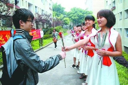 昨天早上7点半,西南大学橘园八舍门口,一边挂着 “不做夫妻,我们做姐妹吧”的横幅,一边站着6名身着礼服、手捧玫瑰的女生,她们来自自动化1班,正在等候男同学出门,“我们班共有12名女生,43名男生,他们就住在橘园八舍。”拉横幅的女生说,她们从早上7点就忙开了。