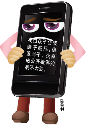 事发后,一名被点名批评的学生家长向记者打来电话诉苦,说看了短信如同五雷轰顶,害怕孩子会破罐子破摔,觉得很没面子。“我自己看了也提心吊胆,因为孩子只考了90分出头,我认为这样的公开批评的确不太妥。”