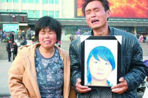 刘秋印手捧女儿刘雪梅的遗像和妻子在火车站前痛哭