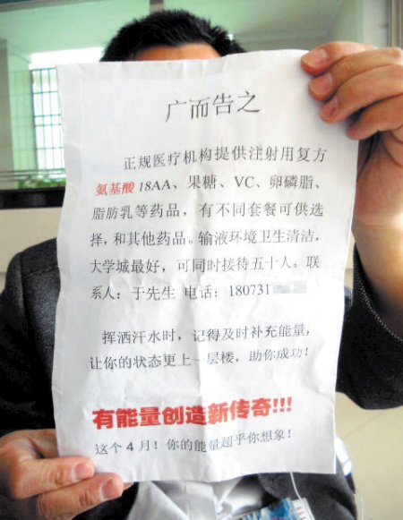 “我们注射的品种有氨基酸、18AA、果糖、VC、卵磷脂、脂肪乳等套餐供选择,一个套餐100元左右。” 昨日,记者以考生家长名义拨打广告纸上留下的电话,一名于姓男子滔滔不绝介绍着注射氨基酸等药品对考生的好处。他说这些药品主要是补充蛋白质和热量,已有不少学生预约注射,绝对不会有任何副作用。记者询问于姓男子他那里是医院还是社区诊所,他回答说是私人诊所,地址在麓山南路上,名叫“麓山门诊”。