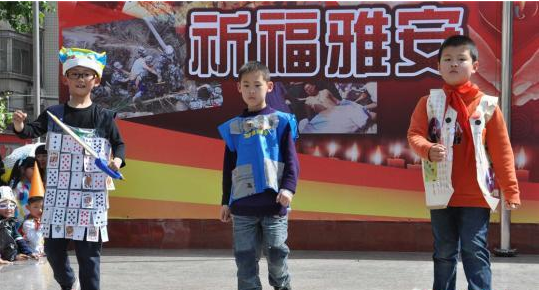 成宝琴说,孩子们在环保时装秀排练的过程当中,四川芦山发生了地震,学校就环保时装秀活动和芦山的捐款仪式融入到活动之中。
