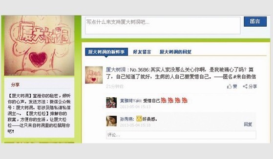 【必威体育官网网页版 5月6日消息】五四青年节刚过,一个以“厦大”命名的网络“树洞”,便以高人气蹿红微信、人人网等社交平台。这个由厦大学生建起的网络“树洞”,不仅能倾听秘密,还能说出秘密,成了同学们的“爱宠”。