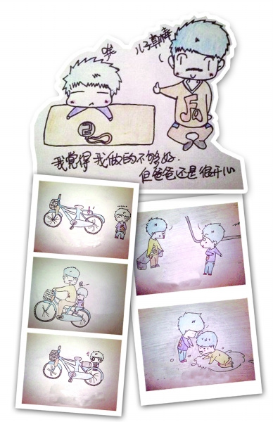小黄告诉记者,这组漫画就是以他父亲为原型来刻画的。“我父亲是一位非常慈祥的父亲,人说‘母爱如水’,我觉得父爱也可以像水一样温柔、细腻。小时候为了让我高兴,父亲特意为我买了奥特曼的光碟,上小学时,父亲为了不让我坐着难受,特意在自行车后座上装上海绵,每次被老师批评时,我红着眼睛见到父亲时,父亲也总是笑眯眯地安慰我。”