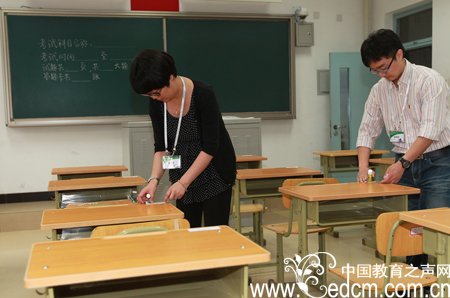 北京27中学今年共有16个考场以及2个备用考场,分布在教学楼的一至四层,每个考场以5列、6行的规格码放30组课桌椅。每层楼道都摆放一个温馨服务台,准备了面巾纸、一次性纸杯、及文具袋,每个文具袋都包括尺子、橡皮、铅笔等考试必备用具。此外,学校还特意准备了校服,如有考生感觉天气较冷,可以向监考老师申请穿校服保暖。