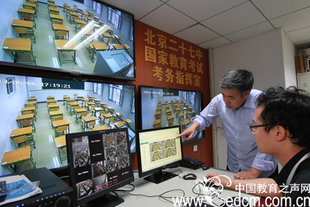 高考前夕,北京市27中学考务人员正在调试监控设备