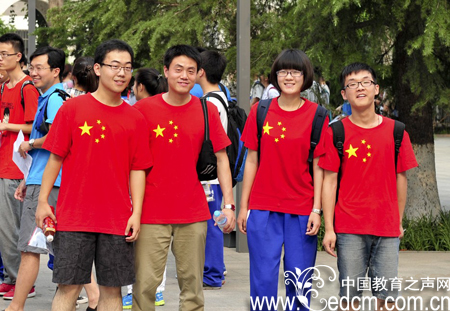 6月7日,济南一高考考点,学生穿“国旗装”赶考。当日,2013普通高等学校招生全国统一考试开考,山东51万考生赴考场,圆梦大学。中新社发 张勇 摄