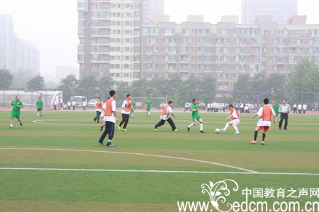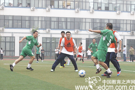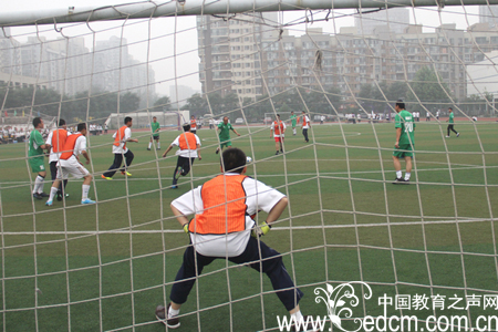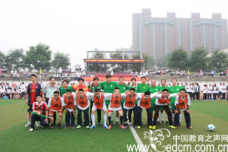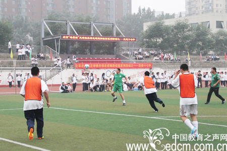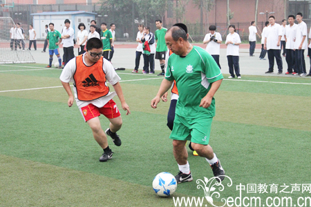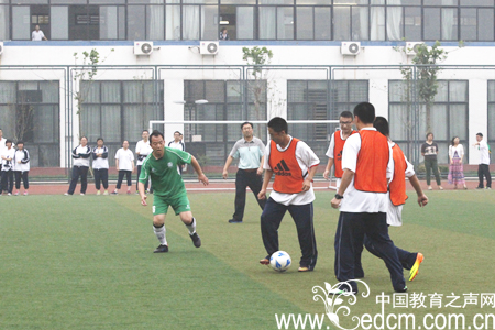 仪式后的友谊赛,则是本次活动的重头戏。老男孩足球队的六位球星和十七中老师组成一队,和学生足球队进行了一场精彩而激烈的友谊赛。十七中马万成、黄达、李亚腾、张磊、姜立超、任伟等老师分别披挂上阵。中场休息时,老男孩的球星、我校老师和同学们还进行了有趣的足球射门游戏。最终,老男孩与教师联队以3:1的比分获得了胜利。