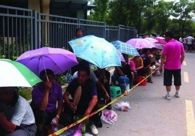 自带小板凳坐在南侧队伍里的许大爷说,他们6月8日就来等候了,晚上甚至有家人“值守”。在这里排了一个多星期的李先生表示,虽然幼儿园一直没有发布公告,但因为去年就是按照排队顺序报名的,大家都依惯例排队。排在这个队伍前面的大多是老年人,他们从家里带了小板凳、遮阳伞、扇子,还是汗流浃背。