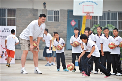 6月30日,2013姚基金慈善赛学校探访活动在北京昌平区汇蕾学校举行,姚明与参加慈善赛的芝加哥公牛队的诺阿亮相活动现场。记者吴江 摄