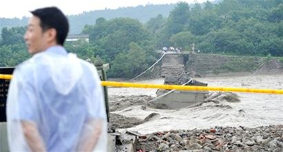 昨日11时许,因持续暴雨引发洪水,江油市青莲镇盘江大桥(老青莲大桥)被冲垮,有车辆和行人落水。盘江大桥已有数十年历史,汶川地震后虽经过维修加固,但因洪水来势凶猛,水流太大而垮塌。