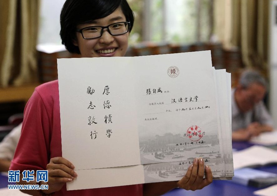 陕西师范大学招办主任惠刚在接受记者采访时表示,陕师大于2007年在首届免费师范生招生录取时开始用毛笔书写本科录取通知书,通知书也采用了相应材质的纸张,今年要发出4570份通知书。截至昨天下午6时,已完成2200多份通知书的书写。