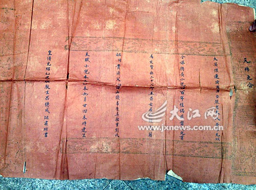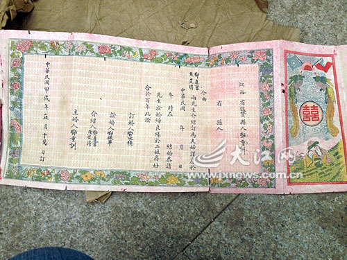 昨日上午,熊先生用编织袋装着木箱子以及契约凭证,在进贤县一个广场与记者见面。脱色的小木箱内,还有一个隔层,各种书籍用牛皮纸包裹着。原本装在木箱里的契约凭证,被熊先生一张张装进了文件袋里。熊先生说,去年下半年,他们家准备将位于三阳镇的祖屋拆除。在拆除过程中,熊先生在老屋发现,一个小木箱用麻绳系在房梁上。由于当时忙着拆房,熊先生是隔了一段时间才将木箱打开。此时,才发现里面装着各种契约凭证和书籍以及一个瓷笔筒、陶杯、砚台。记者看到,契约凭证的时间跨度从康熙五十八年至1953年,共有100余张。其中涉及土地、农田、湖、洲、树木、房屋等各项东西的买卖。此外,还有征收钱粮的执照,以及一些书籍和手抄的对联、祭文、贺亲朋的名单等物件。书籍上,还写着熊先生爷爷的名字以及其他族亲的名字。在这些“宝贝”里面,还有两张“大红纸”。一张是熊先生奶奶的结婚证书,另一张则是光绪年间吕家向熊家下的结婚聘书。
