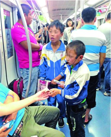 地铁里穿“校服”乞讨的孩子