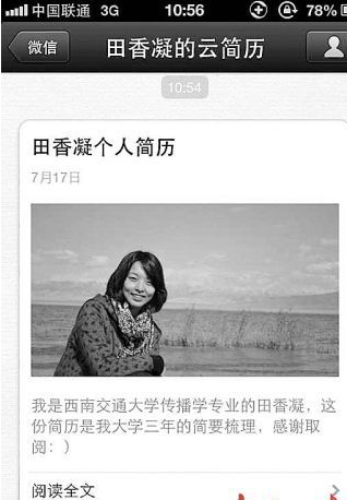 【必威体育官网网页版 7月19日消息】毕业季刚过,699万毕业生涌向市场,今年被称为“史上最难就业季”,许多学生为了能够吸引到用人单位的“眼球”,在制作简历上下足了工夫。近日,西南交通大学传播学大四女生田香凝创建了一个名为“田香凝的云简历”的微信公共账号,以文字、图片、声音和视频的“富媒体”形式来展现自己。本月15日上线开始到昨日,在短短的三天之内,“田香凝的云简历”的公共账号粉丝数已突破500,有五家公司相继向她抛出了橄榄枝。