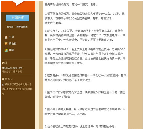 “网上征婚太不靠谱,况且这位男士要求太过分。”在江汉路经营外贸服装的陈小姐称,“现代女性的经济条件也不错,性格、家庭地位等因素也成为结婚的考虑因素。经济条件好的男士不要自恃过高。”