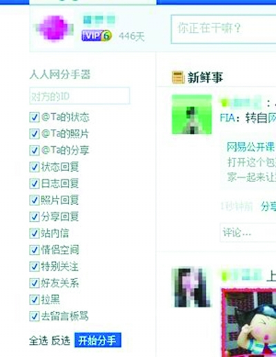 在Chrome网上应用中心下载后,登录自己的人人网主页,“分手器”应用便出现在主页左侧。接下来,只要你输入分手对象的账号,@Ta的状态、@Ta 照片回复、@Ta的分享、状态回复等13项删除应用供你选择。选定后点击“开始分手”,网上信息就灰飞烟灭。信息一旦删除,软件不提供恢复功能。不过,你能删除的只是自己人人网上的信息,同时暂时无人脸识别功能不能一键删除与前情人的合影。