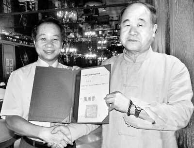据台湾媒体报道,台师大校长张国恩4日上午带领该校文学院院长、国际与侨教学院院长、国文系主任以及应用华语文学教授等人,在台北与媒体茶叙时宣布,已成功延揽并礼聘到大陆诺奖得主莫言担任该校讲座教授,同时还拿出莫言接受聘书时与张国恩的合影(见图)。