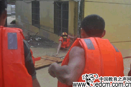 在利用群众提供的一只自制简易木筏解救出传达室内的被困妇女后,消防官兵携带救生绳,在拦腰高的洪水中摸索着穿过操场,救出教学楼被困的6名学生。
