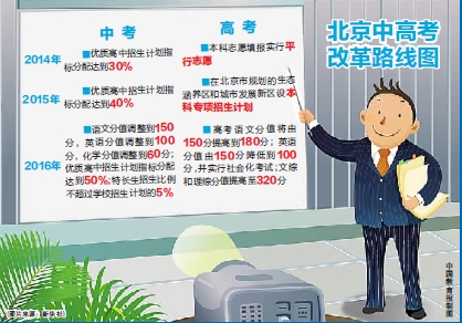 在中考招生方面,方案提出,增加优质高中学位供给,满足更多学生进入优质高中的需求。从2014年开始到2016年,在首都功能核心区、城市功能拓展区内实施优质高中校招生计划,按公平公开原则直接在一般初中校招生,招生比例从30%逐年增至50%。同时,减少特长生入学比例。中考时长也由原来的两天半缩短为两天,将物理、化学两门考试安排在同一个半天。