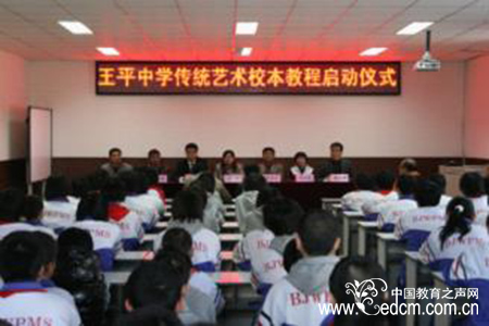 启动仪式上,王平中学聘请了传统艺术校本课程指导顾问和指导教师,并为他们颁发了聘书。谢国平校长在讲话中说:“传统艺术校本课程的开发,是一件利国、利民、利生的大事,学校的发展必须配合王平镇的改革与建设;必须让山区、矿区的老百姓满意;必须让生活在这里的孩子们幸福、快乐、健康、阳光。精美且漂亮的麦秸画属于传统工艺,属于非物质文化遗产,属于我们身边的资源。我们在今后很长一段时间,要把它纳入到学校的课程当中,要逐步形成学校的特色课程,要培养孩子们掌握并传承这一传统工艺。”