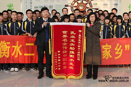 衡水二中副校长王锦旭向蒙牛乳业(衡水)有限公司赠送锦旗,公司总经理王斌接旗