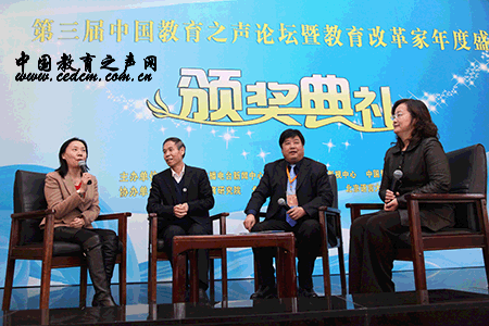 从左至右依次为:北京市朝阳区白家庄小学校长祖雪媛、著名教育家魏书生、河南省项城市中等专业学校校长高必星、北京市丰台区丰台第一小学校长殷楠