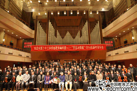 2013年12月22日下午的北京,寒风冷冽,冬日的大街上颇有几分萧瑟的景象。路上行人步履匆匆,就连一向游人如织的天安门广场,也冷清了很多。而就在与天安门广场一公里之遥的北京音乐厅,却是另外一种情形。这里气氛热烈,座无虚席。22日下午14点,由北京市第二十二中学金帆交响乐团举办的2014年新年音乐会,在这里隆重举行。