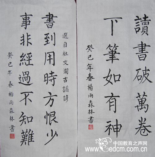 杨雨森林,女,12岁 现就读河北燕郊汇福实验小学5年级。自幼受家人的影响酷爱书画,和手工制作 。自小学一年级跟爷爷学习柳体书法。2010至2013年师从河北书法家进一步学习柳体.其作品代表学校参加多次展出。2012年荣获三河市青少年书法比赛二等奖。走向未来 祖国颂 2013年度全国青少年书画大赛参赛选手。 【作品展示】