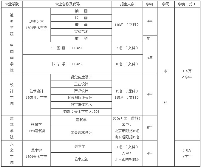 5.建筑学专业录取办法:①专业成绩合格,依据高考文化课成绩排名录取文、理科考生各25名(含北京市、山东省文、理科各4名),文化课成绩最低必须达到考生所在省文、理科 “本科二批”(非艺术类)分数线;②文化课成绩达到我院规定的要求,依据专业课成绩排名(文、理科混合排名)录取30名(含北京市7名、山东省4名);③北京市、山东省招生计划数在录取时学校可根据报名人数、高考文化课分数及专业名次进行相应调整。