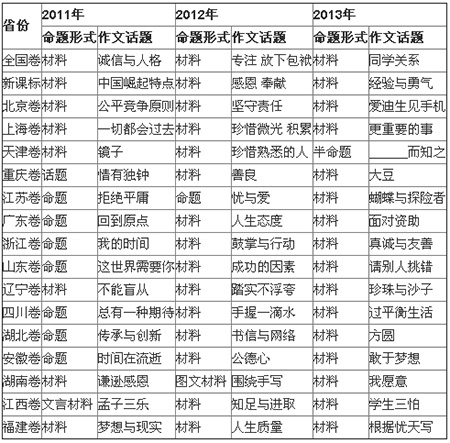 【必威体育官网网页版 5月22日消息】纵观近三年来高考作文的命题形式,由原来的话题作文、命题作文、漫画作文、材料作文的兼容并包、异彩纷呈,逐渐转变为材料作文一枝独秀、独领风骚。对照如下表格可见,2011年高考,材料作文与命题作文平分秋色;2012年高考,除江苏是命题作文外,其余全是材料作文;2013年高考,1个半命题作文,17个材料作文。由此预测,材料作文的生命力将是旺盛的,在一段时期内必定成为作文命题的主流,且2014年高考材料作文很可能一统天下。