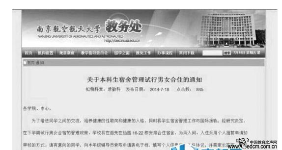 在此次流传的“男女合住”通知当中,南京航空航天大学的版本在微博流传最广,受到的关注也相对较多。网上流传的截图显示,这则题为《关于本科生宿舍管理试行男女合住的通知》发布在该校“教务处”主页上,称“各学院、中心:为了增进同学之间的交流,培养健康的性取向和健康的人格,同时将学生宿舍管理工作与国际接轨,经研究决定,在下学期试行男女合宿的管理政策。”