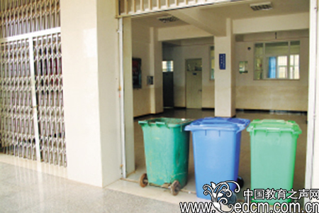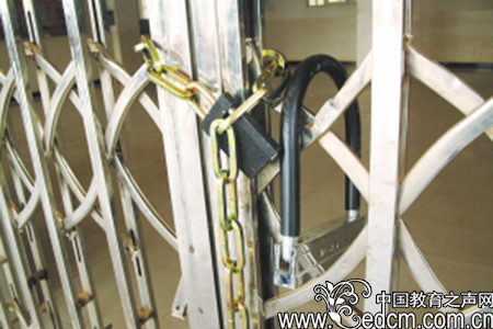 位于篮球场边一栋崭新教学楼的唯一出入口处,两道伸缩铁门分别被一把“铁将军”紧紧锁着。