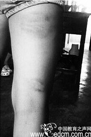 小陈是琼海市阳江镇某中学的初三学生,昨日放假回家后,家长发现其大腿部位有多处淤痕,在家人的追问之下,小陈才说是因为自己没完成作业,老师用电缆线抽打的。虽然好几天时间过去了,但是小陈大腿上的淤痕还是很明显,青一块紫一块的,看着让人很心疼。