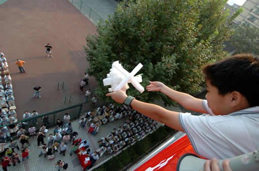 每位参赛者要迎接一个艰巨的挑战:从离地12米的高度,让鸡蛋自由落体,最终安然回到地面指定区域,且附加材料不得超过100克。赛前有同学尝试过,如果没有任何举措的让鸡蛋落地,落地倒是精准,可蛋浆崩裂、体无完肤。如何既保证鸡蛋准确落到指定点,又把鸡蛋撞地的高风险化解为零呢?离大赛来临还有一个月的时候,同学们就积极主动地展开学习、探索与尝试。