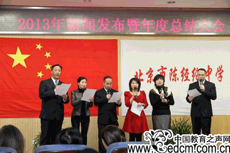 陈经纶中学副校长胡砚、牟成梅发布陈经纶中学2013年十大新闻和本部高中2013年十大新闻。本部初中、保利分校、帝景分校、嘉铭分校依次发布各校区2013年十大新闻。“陈经纶中学在‘第三届教育之声论坛暨教育改革家年度盛典’中荣获2013年度最具国际化学校和最具幸福感学校称号”名列陈经纶中学2013年十大新闻头条。
