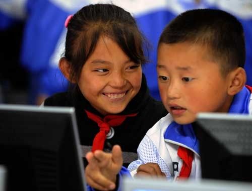 “一面‘大锅’朝天扬,五洲四海到机箱,数理化生样样有,连着知识大海洋。”农村现代远程教育不仅给教育带来一场新的革命,而且也为促进教育资源共享、维护教育公平带来了新的契机,提供了新的手段。图为宁夏海原县第三小学的两名学生在利用远程教育手段学习知识。