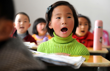 3月18日,学生在57岁的江焕云带领下学唱歌。