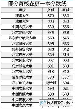 今年本市高招一本线为:文科565分,理科543分。昨天中午,清华大学、北京大学先后公布了今年在京本科一批的提档线。清华大学按照1:1投档,在京文科分数线为670分,超一本线105分;理科分数线为682分,超一本线139分。北京大学文科分数线663分,超一本线98分,理科分数线683分,超一本线140分。