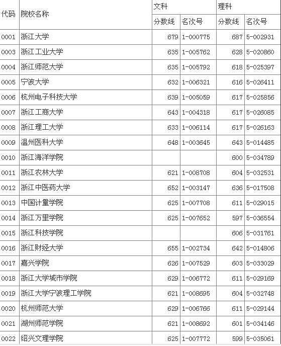 浙江省2014年普高文理科第一批首轮平行志愿投档分数线表