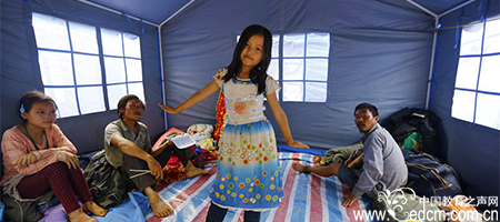 9岁的唐天星在救灾帐篷里给大家表演舞蹈。不大的帐篷里住着三户人家,但是此时,他们成为了一家人。