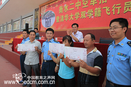 空军招飞局北京选拔中心领导将清华大学双学籍飞行员录取通知书送到家长手中