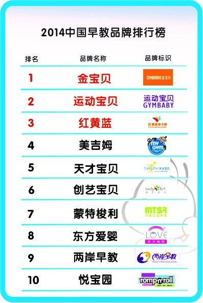 随着国家十二五规划对幼教行业的重视和发展,2014年,早教行业继续作为教育界的朝阳产业备受关注。伴随早教行业井喷式的发展,鱼龙混杂的早教市场和琳琅满目的早教品牌让家长在给宝宝选择早教机构时频频犯难,一旦选择失误,不仅让家庭损失大量的精力和财力,更重要的是对宝宝的健康成长造成极大的不良影响。对此,某权威教育机构根据详细的市场调查和数据分析,2014中国早教品牌排行榜最新出炉,分别为:金宝贝、运动宝贝、红黄蓝、美吉姆、天才宝贝、创艺宝贝、蒙特梭利、东方爱婴、两岸早教、悦宝园。
