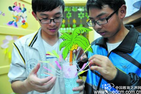 毛应平和刘建鸿还将废旧塑料瓶剪成细小的段,做成了一个简易的花瓶,边角料做成了树枝插进花瓶里。“可以装饰,也可以当一个小小的垃圾箱。”刘建宏说,他本来不会做手工,但想着女生寝室不能这么素,前一天晚上特地上网查了资料,模仿着做了出来。