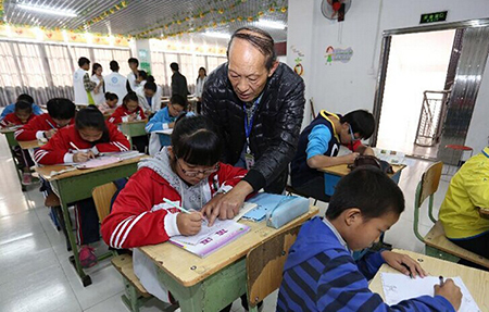 当日,73岁的党员志愿者张铭九指导学生写作业。四川省攀枝花市西海岸菜市场有一家恒力·辉荣春芽书屋“六点半学校”,为菜市场商户的孩子等中小学生提供免费学习和读书的场所。据了解,西海岸菜市场现有商户1200余家共计100余名孩子,大都在读小学和中学,71岁的党员志愿者王辉荣来这里买菜时看到他们每天只能趴在父母的摊位上写作业,便萌生了建一个书屋的想法。在有关部门的支持下,2013年8月,攀枝花市图书馆、辉荣志愿者协会、攀枝花市恒力集团等共同筹建了这一书屋。目前,书屋共有各类图书千余册,同时设有六点半学校、团体心理活动室、科普活动室、图书阅览室、电子阅览室、心理咨询室等“一校五室”,并有专兼职志愿者百余人为青少年提供学习辅导、心理辅导等志愿服务。