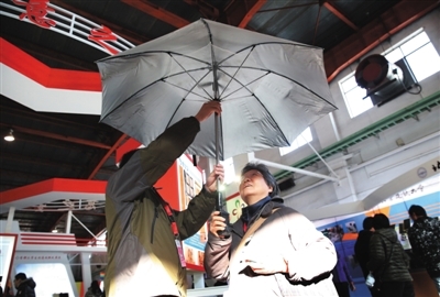 华北电力大学的陈冬展示了他们团队设计的多功能太阳能伞,引来观众围观。伞柄处有太阳能电池,输出电流可用于夜间照明和手机充电,内部伞顶安置了一个电风扇,夏季时可以消暑。陈冬说,他们正在对这把伞进行改进,在顶部风扇安装空气净化装置,希望把这把伞变成“防霾伞”。听到“防霾伞”的创意,一些观众兴趣更浓了,还有一些人询问如何跟学生们合作,开发商业价值。