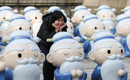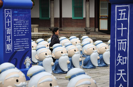 12月23日,一位女士在台北孔庙参观Q版孔子雕塑。