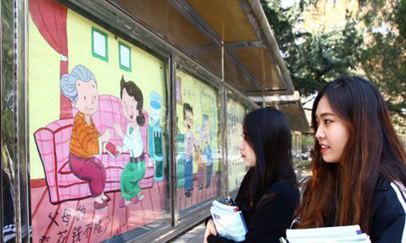 “节假日尽量与父母共度,亲自给父母做饭,对父母的爱要说出口……”记者27日在山东师范大学看到了由大学生绘制的新二十四孝图,图文并茂,与现代生活联系,贴近老年人实际生活需要,吸引了众多大学生驻足观看。