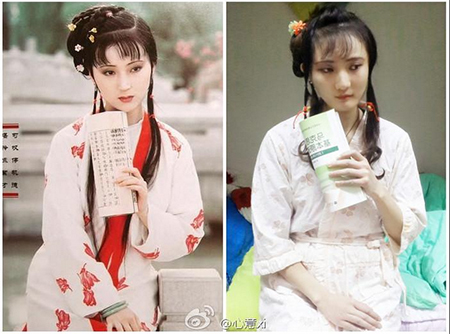 这组图片被拍摄出来,与林晓旭扮演的黛玉原图一相比,还真有几分神似。图片被放上微博后,立即引起了众网友的转发和评论。但扮演者@Sweety_没心没肺 身穿睡衣手持《马哲》肩扛晾衣杆的低成本制作,也着实乐翻了一众网友。