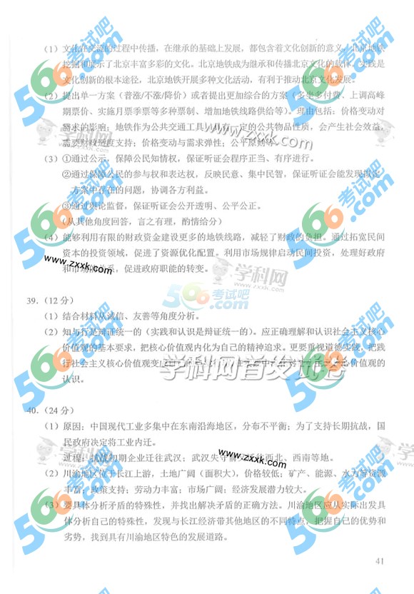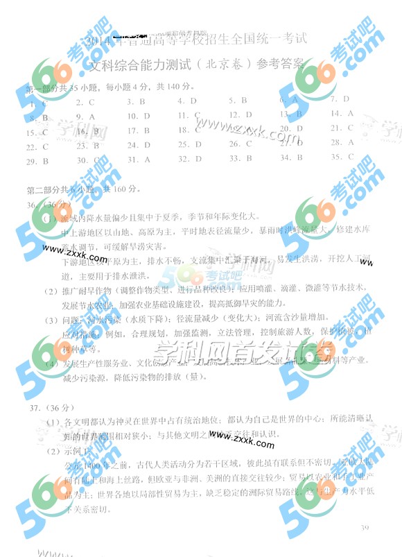 2014年北京高考文综答案(完整版)