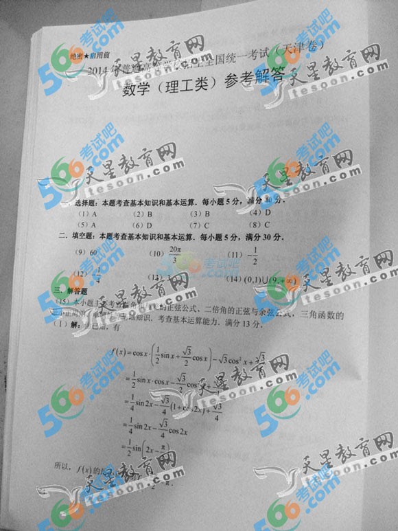 2014天津高考数学答案及解析(文科)